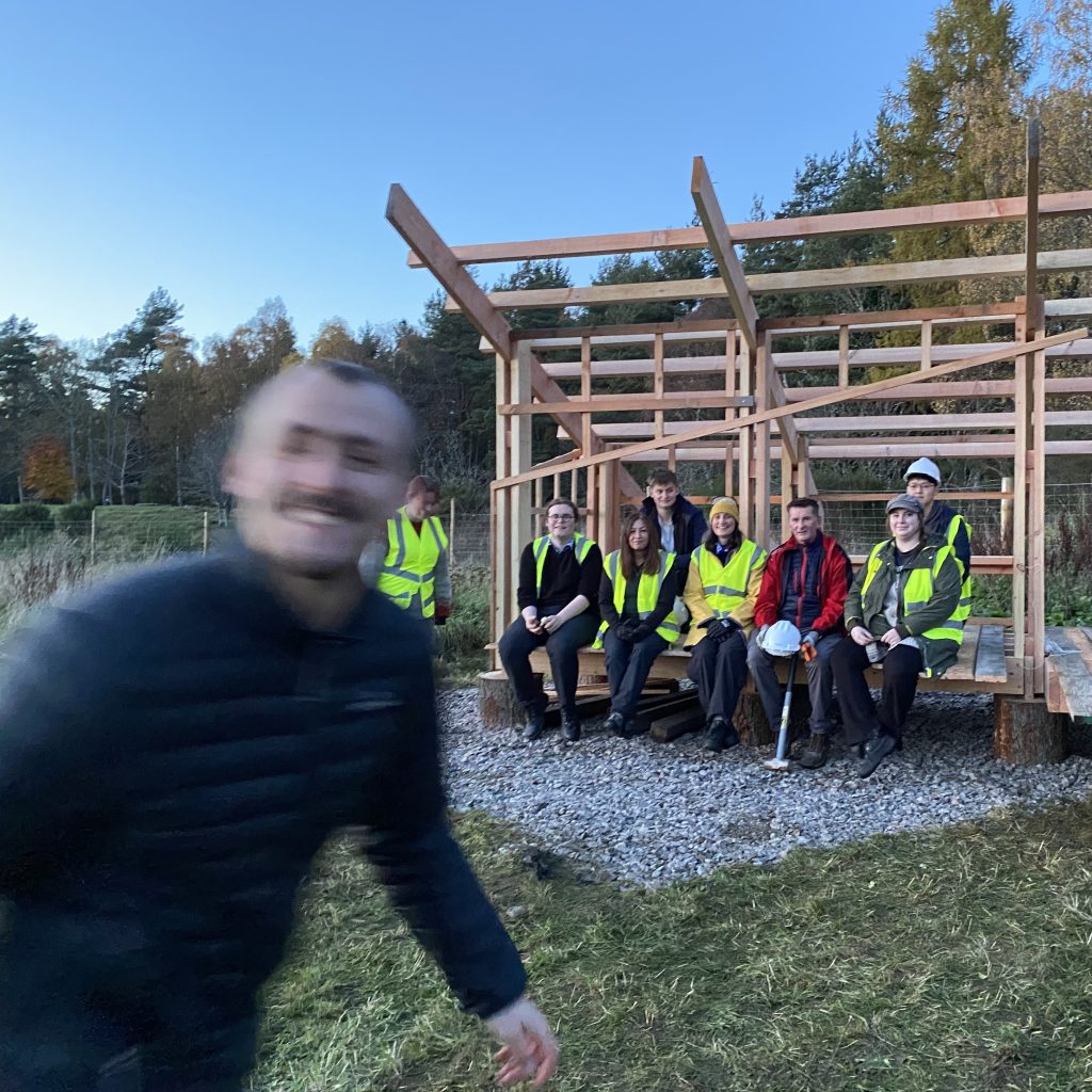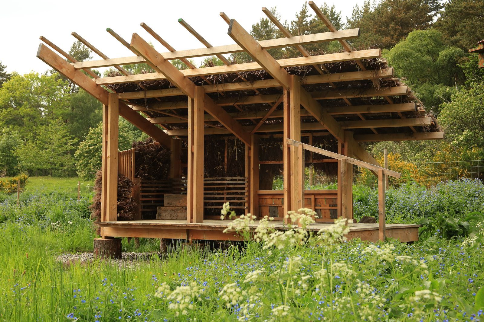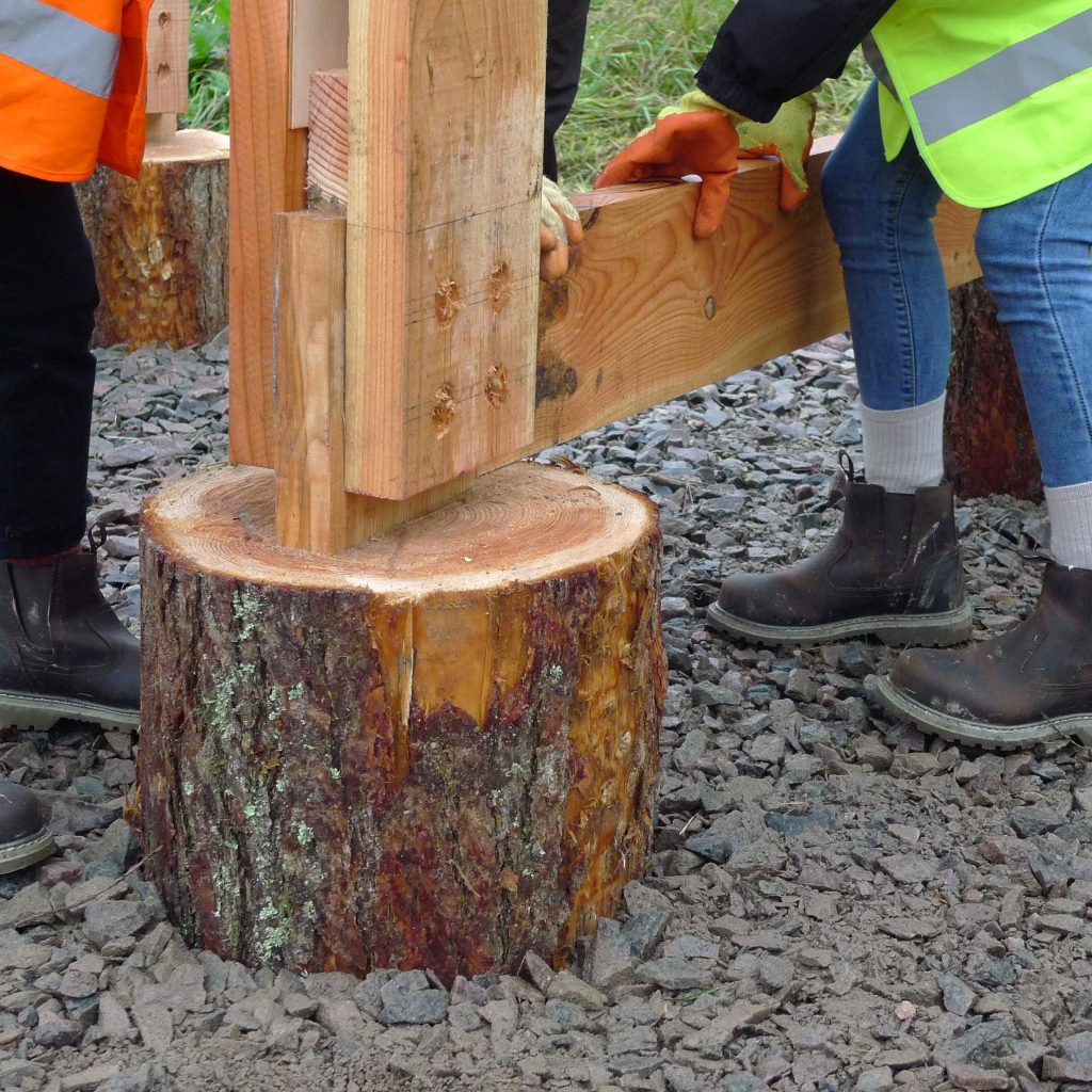 The project sought to avoid the use of concrete or any other invasive methods in the build, so colleagues at Mackintosh School of Architecture designed innovative foundations which were made from fir tree logs, and fabricated by our supportive industry partners Logie Timber. It took time and team work to lay the foundation feet, but they worked a dream!